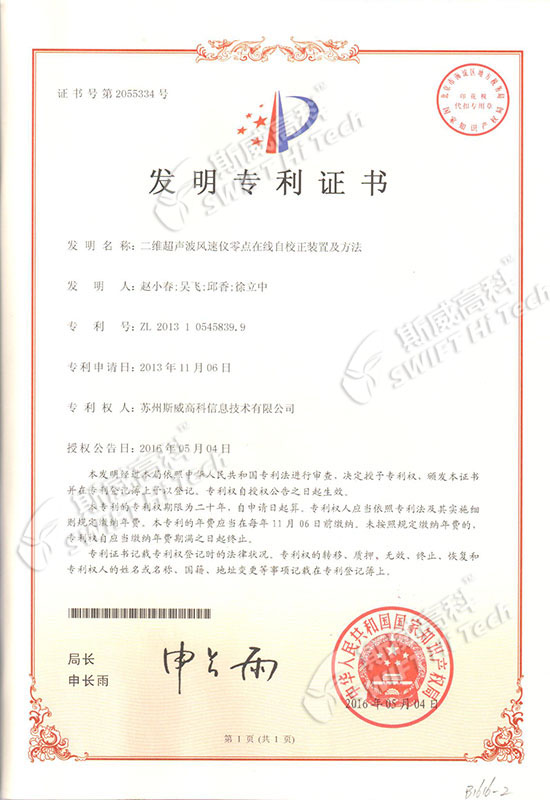 發(fā)明專利證書(shū):二維超聲波風(fēng)速儀零點(diǎn)在線自校正裝置及方法
