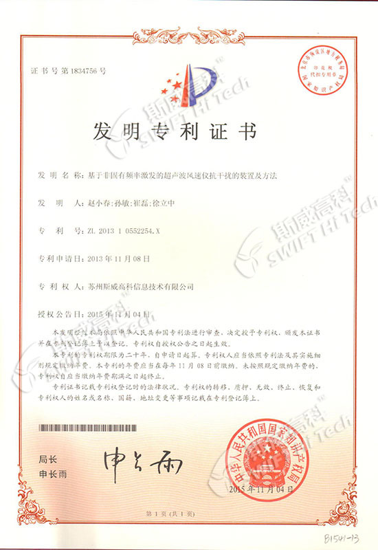 發(fā)明專利證書(shū):基于非固有頻率激發(fā)的超聲波風(fēng)速儀抗干擾的裝置及方法