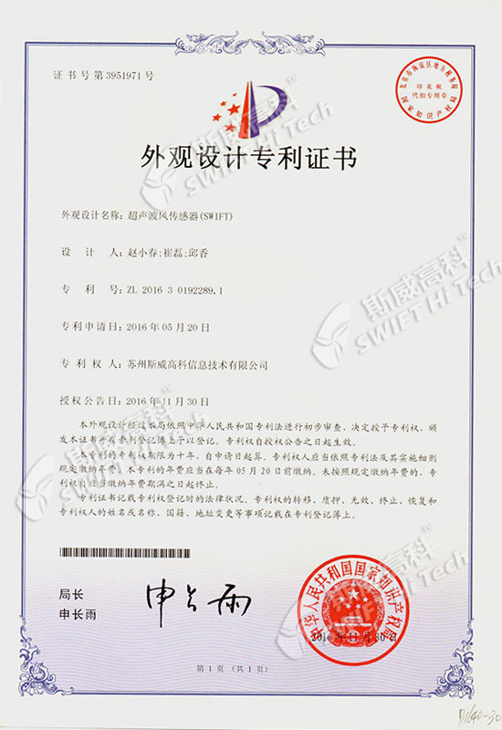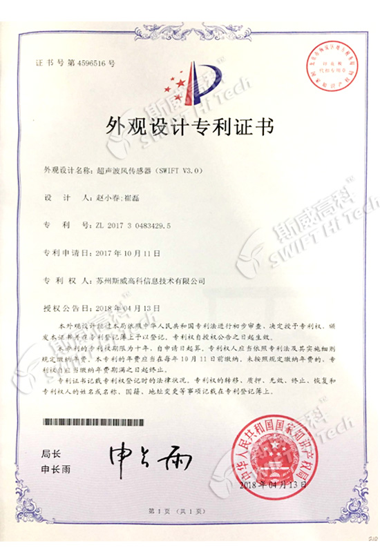 外觀設(shè)計(jì)專利證書(shū):超聲波風(fēng)傳感器(SWIFT)