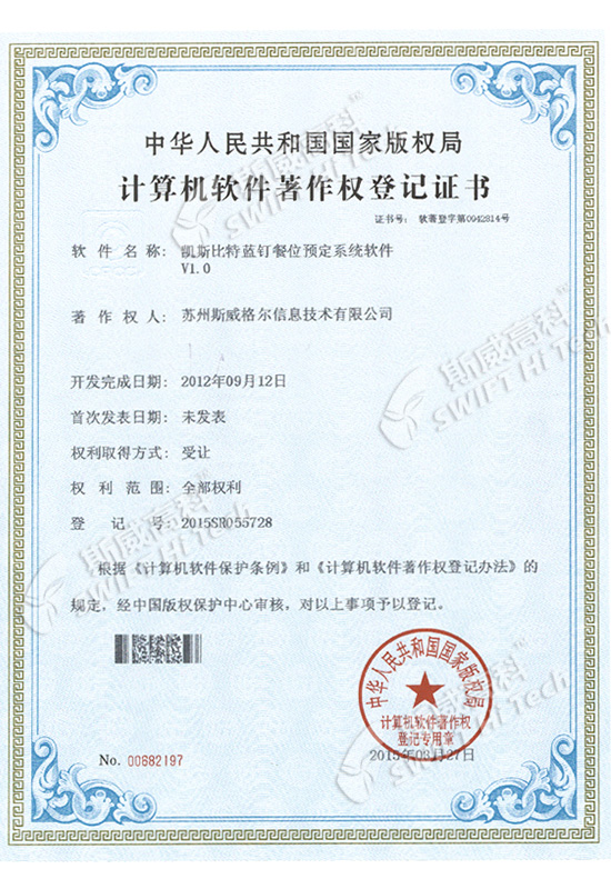 凱斯比特藍(lán)釘餐位預(yù)定系統(tǒng)軟件V1.0 登記證書(shū)