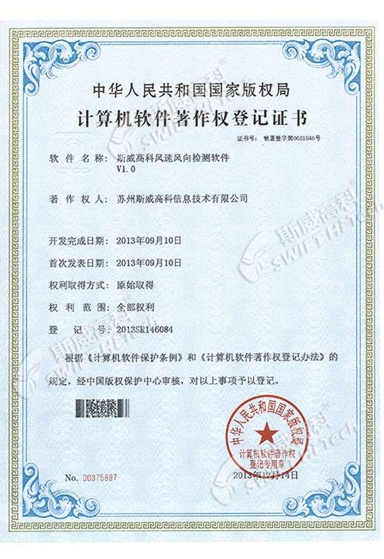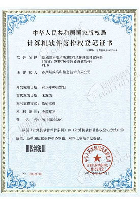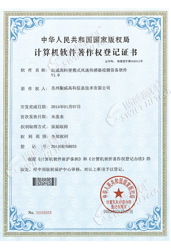斯威高科風(fēng)速傳感器軟件V1.0 登記證書(shū)