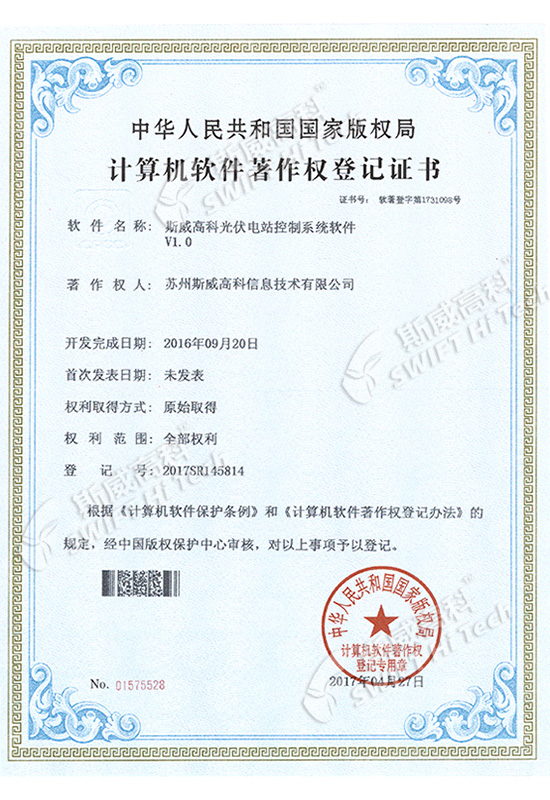 斯威高科光伏電站控制系統(tǒng)軟件V1.0 登記證書(shū)