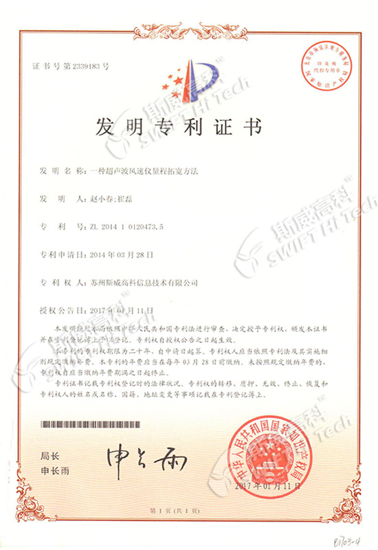 發(fā)明專利證書(shū):一種超聲波風(fēng)速儀量程擴(kuò)寬方法