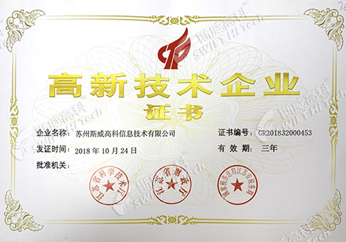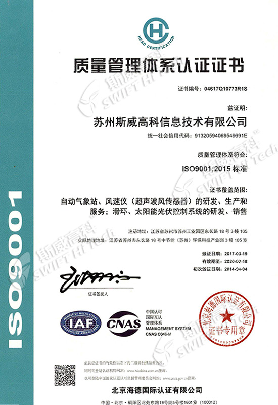 蘇州斯威高科信息技術(shù)有限公司 質(zhì)量管理體系認(rèn)證證書(shū)