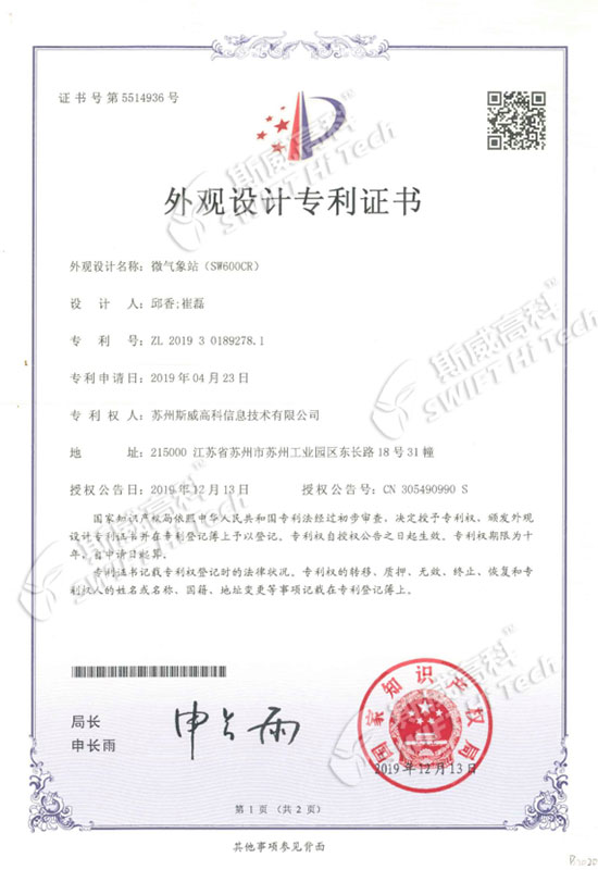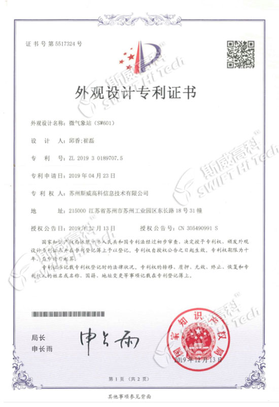 蘇州斯威高科信息技術(shù)有限公司 外觀設(shè)計(jì)專利證書(shū):微氣象站SW601