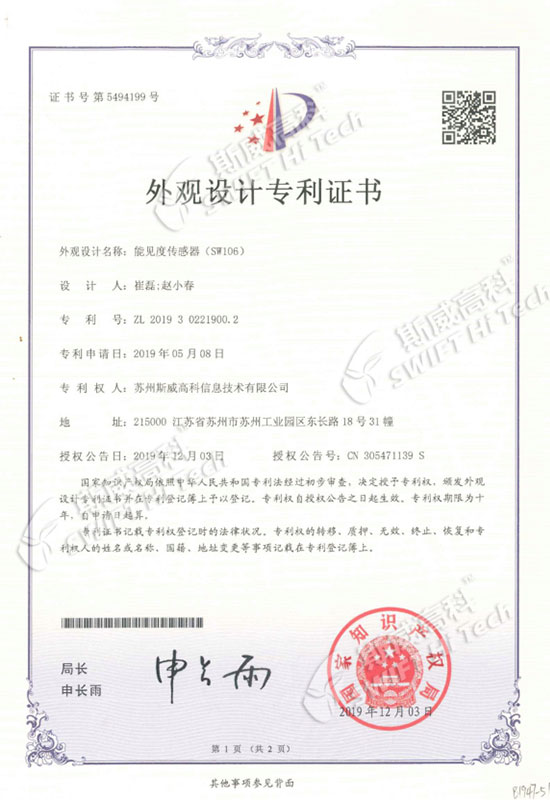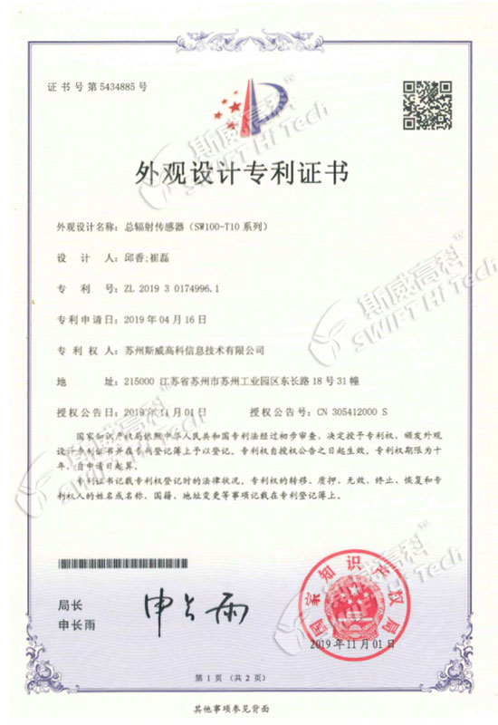 外觀設(shè)計(jì)專利證書(shū):總輻射傳感器 SW100-T10系列