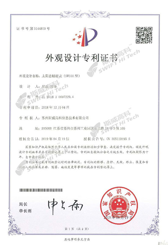 外觀設(shè)計(jì)專利證書(shū):太陽(yáng)總輻射表(SW100)