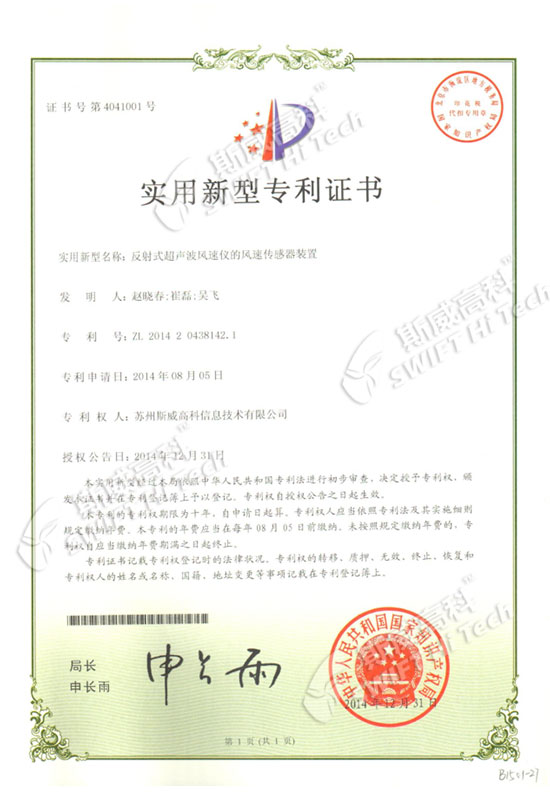 實(shí)用新型專利證書(shū):反射式超聲波風(fēng)速儀的風(fēng)速傳感器裝置