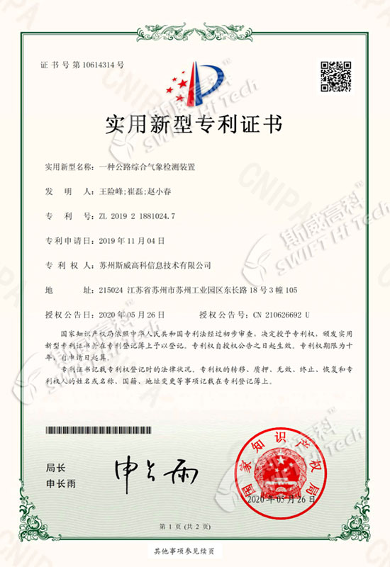 實(shí)用新型專利證書(shū):一種公路綜合氣象檢測(cè)裝置